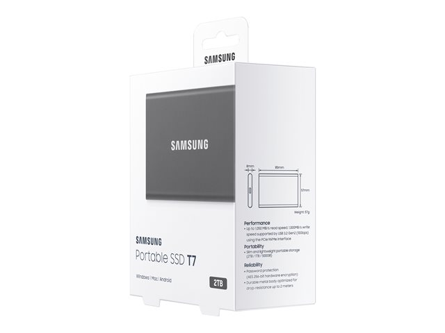 Samsung T7 MU-PC2T0T - SSD - salattu - 2 Tt - ulkoinen (kannettava) - USB 3.2 Gen 2 (USB-C liitin) - AES 256 bittiä - titaanin harmaa MU-PC2T0T/WW